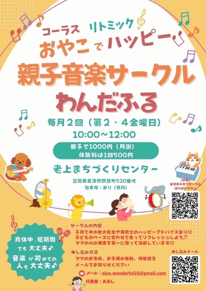親子音楽サークルわんだふる 詳細はこちら https://kusatsu-kosodate.jp/circle/wonderful/ 続きを読む